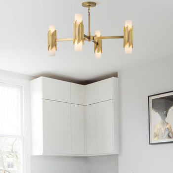 Most of our art deco-style chandeliers feature glass shades with frosted glass. Our chandeliers also come in downlighters and uplighters, depending on whether you prefer the light to be cast on the floor, or spread across the ceiling.