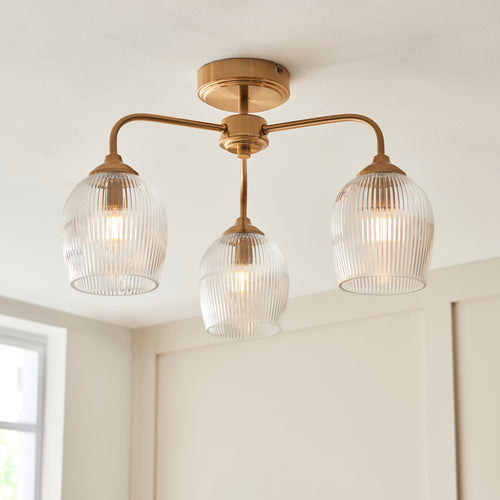 Ashcroft Brass 3 Light Brass Semi-Flush - Ribbed Glass Shades