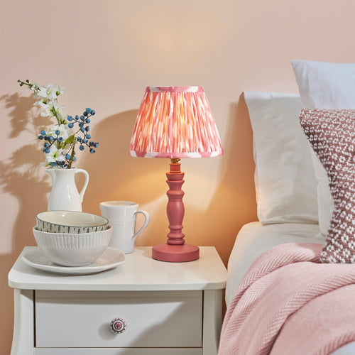 Illuminate your living space with our stunning wooden turned spindle light, elegantly finished in a satin pink clay. This exquisite piece is perfect for classic interiors, adding a touch of sophistication to any room. Featuring a brass B22 switched lamp holder and a stylish grey braided fabric flex, it seamlessly combines functionality with timeless design. Ideal for your living room, this lamp creates a warm and inviting atmosphere, making it the perfect companion for cozy reading nights or relaxing evenings. When paired with our vibrant coral pink 20cm Ikat shade, it offers a unique and classic look that will surely become a focal point in your home. Enjoy peace of mind with our secure delivery service, easy returns, and a safe online shopping experience. Elevate your home decor today with this beautiful lighting solution!