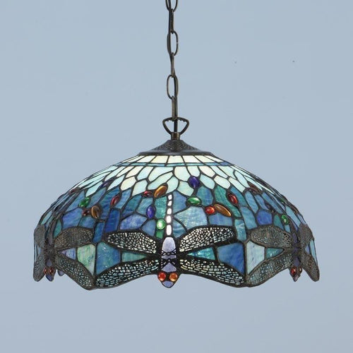 The Blue Dragonfly Tiffany Lighting range by Interiors 1900 is a stunning reproduction of the renowned Tiffany Lamp from the turn of the last century. Hand-cut pieces of art glass are crafted together to create this stunning adjustable Tiffany Ceiling Pendant. Part of a large range of products that will allow you to coordinate your lighting throughout your home. The fully adjustable chain means you will be able to fit this light perfectly in your home. The Blue Dragonfly Tiffany Lighting Range also includes a variety of other ceiling lights, as well as wall lights, and table and floor lamps.