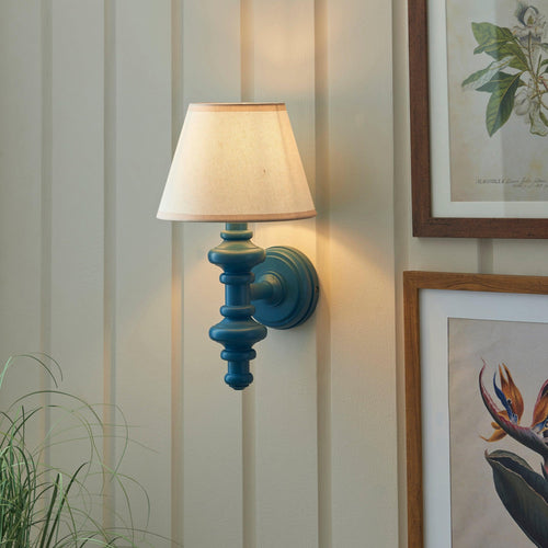 Introducing our exquisite wooden turned spindle wall light, a stunning blend of vintage charm and contemporary elegance. Inspired by timeless design aesthetics, this piece features a rich satin marlin blue finish, complemented by a classic brass B22 lamp holder that exudes authenticity and sophistication. To enhance its appeal, we've paired this wall light with our beautifully crafted 20cm Ivy shade in vintage almond white, creating a unique and classic style that will elevate any living room decor. Explore our coordinated lighting range to find the perfect match for your space, ensuring a cohesive and inviting atmosphere throughout your home. Shop with confidence knowing that we offer secure delivery, hassle-free returns, and a safe online shopping experience. Illuminate your living room with this stunning wall light and transform your space today!