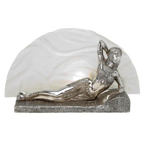 Hand cast in the UK from solid brass, this Art Deco Statuette comes in an antique chrome finish. The prone figure of Cleopatra is silhouetted by the sun lighting up behind her, to create a truly stunning piece.