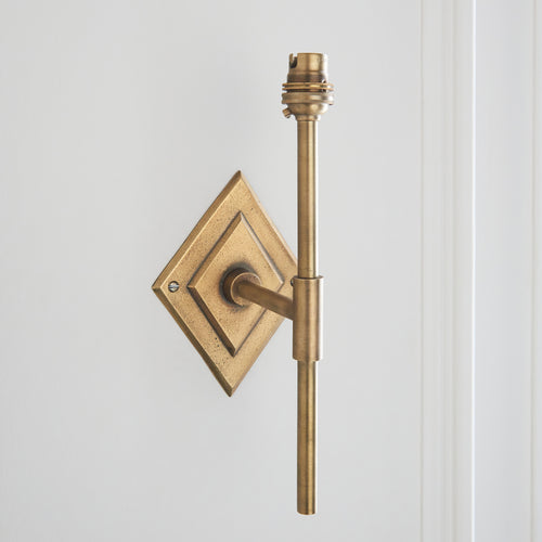 An elegant diamond-shaped solid cast wall back with 'T' shaped arm, finished in brass patina, featuring a classic brass B22 lamp holder. The timeless flat wall back re-creates that authentic look from the past. Due to the artisan sand casting and hand finishing processes, each wall light may vary in surface finish and colour, enhancing the unique beauty of every individual piece. Perfect when paired with one of our 16cm or 20cm decorative fabric shades. Easy self-assembly of the arm and wall back with the fixing tool supplied.