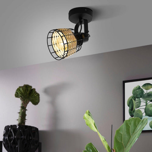 The ANWICK 1 wall and ceiling light is made of metal and has an adjustable spotlight featuring a black metal frame paired with natural woven rattan strips. The lampshade creates a fascinating play of light and shadow as soon as the light is switched on. The cosy wall-mounted spotlight blends seamlessly with the current vintage and boho trends and can also be used as a ceiling light. The pivoting head allows you to adjust the light to accentuate individual areas of the room, whether in the kitchen, the living room, the bedroom, the hallway or the dining room. The pictured filament bulb is not included. The product has an E27 lamp holder and requires 1 E27 lightbulb.