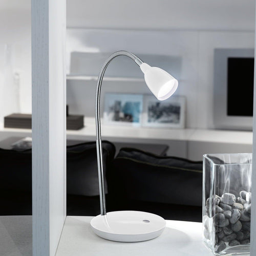 This table luminaire from the series DURENGO is made of white plastic and chrome-plated steel and operated by a rocker switch. It has protective insulation and is equipped with an LED lamp for a warm white light.