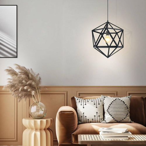 The EMBLETON pendant light features a black diamond-shaped metal lampshade and an exposed lightbulb socket. The lampshade's metal framework creates a fascinating play of light and shadow when the light is on. The pendant light blends seamlessly with interiors in the trendy industrial style. It provides distinctive lighting for your home, whether in the living room or above the table in the dining room. The pictured filament lightbulb is not included. The product has an E27 lamp holder and requires 1 E27 lightbulb.