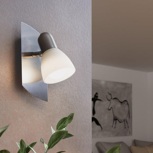 The ENEA wall or ceiling spotlight has a matte nickel metal body and an adjustable satin glass spotlight. The wall-mounted spotlight can be integrated into almost any interior design style and is used as a ceiling light. It can also be switched on and off using the switch on the light itself. The pivoting head allows you to adjust the light to accentuate individual areas of the room, whether in the kitchen, the living room, the bedroom, the hallway or the dining room. The pictured lightbulb is not included. The product has an E14 lamp holder and requires 1 E14 lightbulb.