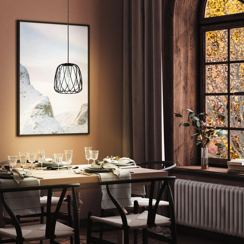 The FLORESTA pendant light has a rounded black wire lampshade surrounding an inner smoked glass cylinder. The lampshade’s stunning interlaced wire design creates a fascinating play of light and shadow when the light is on. This trendy pendant light complements modern interiors and creates the right mood in any space. The product requires 1 E27 lightbulb which is not included.