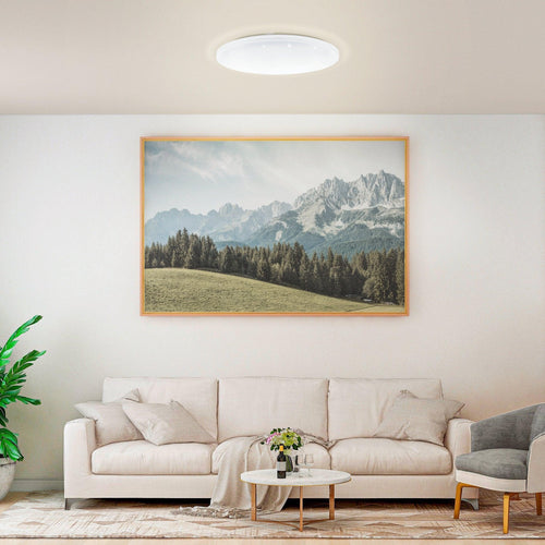 The FRANIA-A LED ceiling light from the remote-controlled Access range has a round white plastic cover and a white metal base. When the light is on, it creates a sparkling effect like stars in the night sky. The integrated LEDs produce a pleasant light that can be adjusted as required. You can choose between warm white, neutral white and cool white light. The light is controllable using the included remote control, which also offers other features such as brightness adjustment, a nightlight and a timer (which switches off after 30 minutes), plus two pre-set lighting modes. You can also use the remote control to control up to eight Access lights at the same time and save custom lighting settings. With a diameter of 57 cm, the ceiling light blends seamlessly with modern and minimalist interiors and provides stylish lighting for any space, whether in the kitchen, living room, bedroom, hallway, dining room or office.