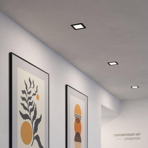The FUEVA 5 recessed LED light is made of black metal and measures 117 mm. With its height of just 26 mm and square shape with rounded corners, it works well in almost any living space and can even be installed in insulating material. The integrated LEDs are covered by a white diffuser and produce a neutral white light. A recess of ∅ 105 mm is a requirement for installation. The recessed spotlights classic design and neutral white task light are perfect for any space where good lighting is needed, such as the kitchen, hallway, utility room or office.