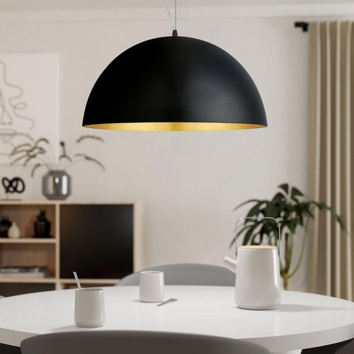 The GAETANO 1 pendant light has a round lampshade made from black steel with a gold leaf-style finish. This pendant light complements a range of interiors and will provide stylish lighting in any home, perfect for the living room or above the dining room table. The lightbulb is not included. The product has an E27 lamp holder and requires 1 E27 lightbulb.