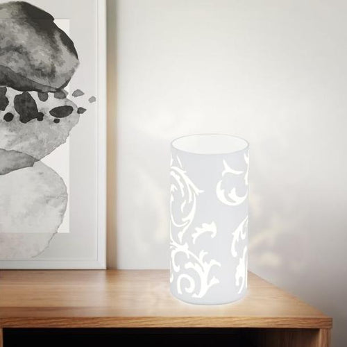 The GEO table lamp features a white glass cylinder imprinted with a floral motif in white. The table lamp has a height of 20 cm and blends into various interiors. The product can be switched on and off easily using the in-line switch. Whether on a bedside table or in the living room or hallway, it provides stylish lighting for any interior. The product requires 1 E14 lightbulb that is not included.