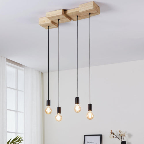 The HALKIN pendant light features four connecting natural rubberwood blocks with a black lamp holder suspended on a black cable from each one. Whether in the living room, dining room, hallway or bedroom, the pendant light's simple yet homely design provides appealing lighting for any space. The pictured filament lightbulbs are not included. The product has E27 lamp holders and requires E27 lightbulbs.