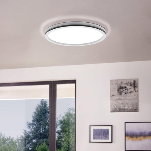The LAZARAS LED ceiling light has a white metal structure with a round light panel made from white plastic. Running around the edge of the product is an LED light ring, which produces attractive, indirect RGB light when the light is on. The ceiling lights integrated LEDs create a light that can be adjusted as required. You can choose between warm white, neutral white and cool white light. The two light elements can be switched on separately or together using the supplied remote control, and the brightness is adjustable. The product has a minimalist design that blends superbly with modern interiors and provides stylish lighting for your home.