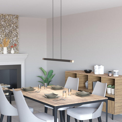 The LISCIANA pendant light features a suspended aluminium profile finished in dark brown with rubberwood detailing in a walnut finish. The light’s modern look is complemented by the black textile cables and metal canopy. The integrated LEDs behind the matte white plastic light panel can be dimmed using a coordinating rotary dimmer on the wall and produce a pleasant warm white light. With its linear design and length of 87.5 cm, the pendant light provides ideal lighting above the dining room table.