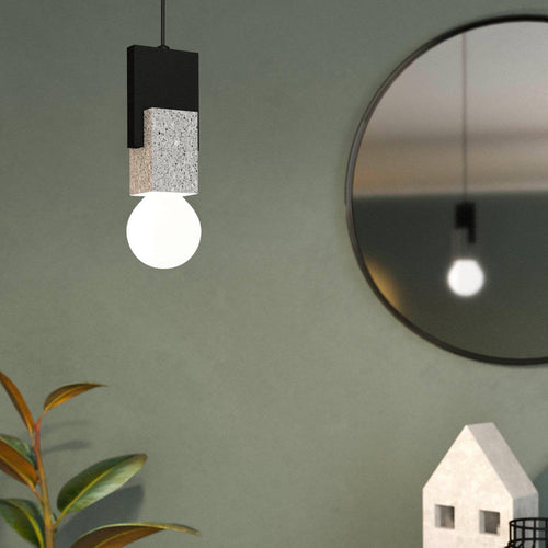 The LOBATIA pendant light features an angular lamp holder with a grey finish and white speckled terrazzo combined with a black wood element. The lamp holder is suspended from a black metal mount. The product has a compelling mix of metal, wood, and terrazzo materials, and the minimalist pendant light blends perfectly into modern interiors. The product provides stylish lighting for your interior, whether in the living room or above the dining room table. The pictured lightbulb is not included. The product has an E27 lamp holder and requires an E27 lightbulb.