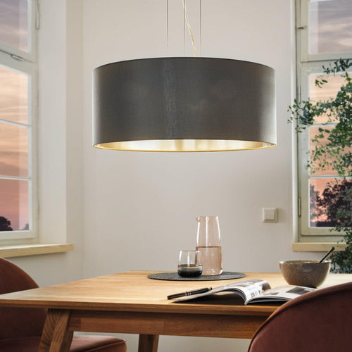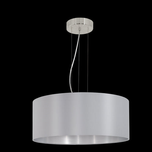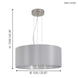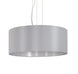 This pendant luminaire from the series MASERLO is made of satin nickel steel and fabric in the colours grey and silver. It has protective insulation and needs three E27-lamps to shine.