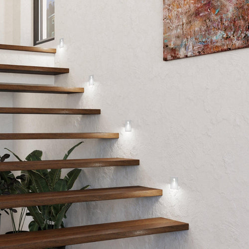 The MECINOS recessed LED stairway light has a white metal finish and measures 80 mm. The integrated LEDs produce a pleasant warm white light. The light is 55 mm deep and requires a 68 mm recess. The recessed spotlight’s elegant-looking design will blend perfectly into your stairwell entrance and provides attractive indirect lighting.