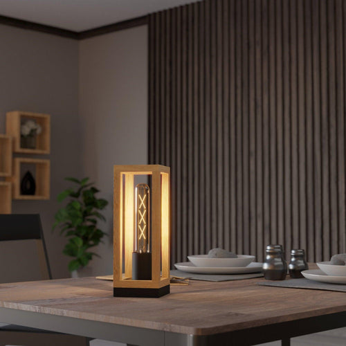 The NAFFERTON table lamp features a black steel base and lamp holder with wooden bars surrounding an exposed lightbulb. The table lamp's mix of metal and natural materials creates a modern design and complements a range of interior styles. The modern table lamp offers ambient lighting in any room, whether in the living room on a side table, bedroom on a bedside table, dining room or hallway. The product has an E27 lamp holder and requires 1 x E27 lightbulb, which is not included.