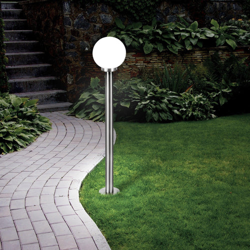 The NISIA pathway light features a stainless steel post paired with a spherical glass head in a white satin finish. The bollard light is suitable for outdoor use due to its IP44 protection against spray water. Due to the classic design, the exterior light blends into any modern outdoor space, whether on a path or driveway, entrance area or terrace. The lightbulb is not included. The product has an E27 lamp holder and requires an E27 lightbulb.