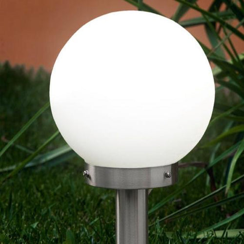 The NISIA exterior post light features a stainless steel post paired with a spherical glass head in a white satin finish. The post light is suitable for outdoor use due to its IP44 protection against spray water. Due to the classic design, this exterior bollard light blends into any modern outdoor space, whether on a path, driveway, entrance area or terrace. The lightbulb is not included. The product has an E27 lamp holder and requires an E27 lightbulb.