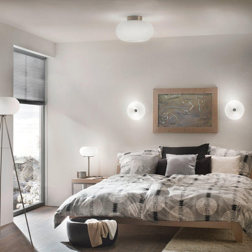 This wall or ceiling luminaire from the series OPTICA is made of satin nickel steel and white, opal-matte glass. The spotlight needs two E27 Light bulbs.