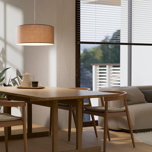 This pendant luminaire from the series PASTERI is made of satin nickel steel and fabric in taupe. The spotlight needs an E27 light bulb.