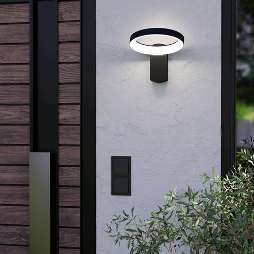 The PERNATE exterior LED wall light features a zinc-plated, anthracite-coloured cast aluminium body with a ring-shaped metal shade. The integrated LEDs behind the white plastic light panel produce a pleasant warm white light, and the product is suitable for outdoor use due to its IP44 protection against spray water. The product has a minimalist design that blends seamlessly into any outdoor area, whether the entrance or the terrace.