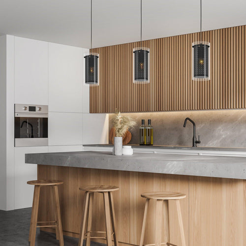 The PINTO TEXTIL 1 pendant light has three cylindrical glass lampshades suspended by black textile cables from a metal canopy. Each fixture has an inner black fabric lampshade with cut-out detailing and creates a fascinating play of light and shadow when the light is on. The pendant light has a simple design that works well in almost any interior style, providing attractive lighting for the living room or over a long table in the dining room.