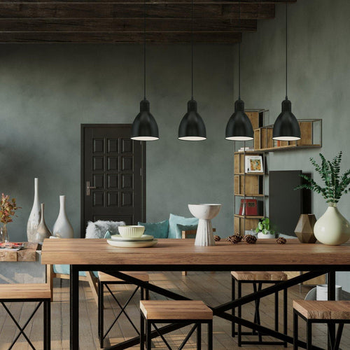 The PRIDDY pendant light features four round metal lampshades finished in black with a white inner surface. The lampshades hang from a rectangular black metal canopy. The product has an industrial-style design and is the perfect finishing touch for modern interiors, providing attractive lighting in the living room or over a long dining room table. Lightbulbs are not included. The product has E27 lamp holders and requires E27 lightbulbs.