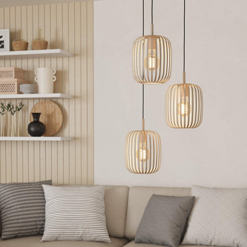 The ROMAZZINA pendant light features three round lampshades made of sand-coloured flat metal strips. The lampshades are suspended from a round canopy by black textile cables at different heights. The metal strips create fascinating plays of light and shadow as soon as the light is switched on. With its soft oval-shaped lampshades, the pendant light fits seamlessly into modern interiors, providing ambient lighting for every room, whether in the kitchen, the living room or above a dining room table. The product has E27 lightbulbs and requires 3 x E27 lightbulbs, which are not included.