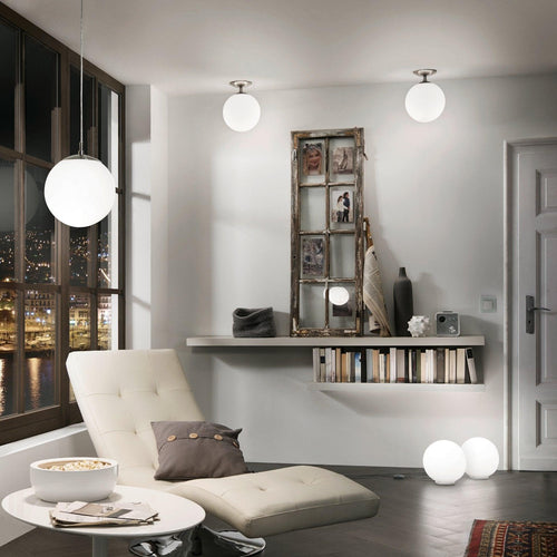 The RONDO ceiling light features a white matte opal glass sphere and a round satin nickel metal base. With its simple design, the ceiling lamp blends seamlessly with various interior design styles and provides cosy lighting for your home, whether in the kitchen, living room, bedroom or hallway. The lightbulb is not included. The product has an E27 lamp holder and requires an E27 lightbulb.