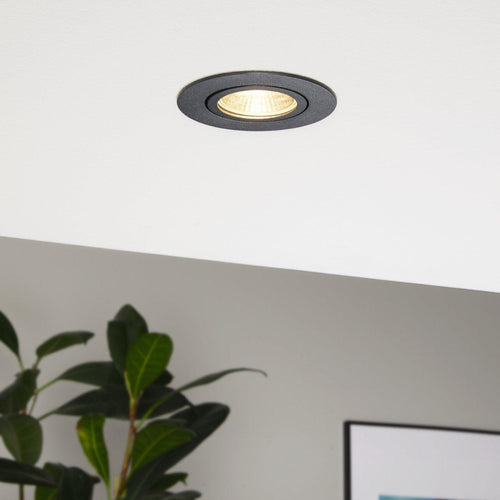 The SALICETO recessed LED light features a black aluminium body with a pivoting spotlight positioned inside a circle frame. The light is 50 mm deep and has a diameter of 88 mm. The pivoting head is fitted with integrated LEDs that produce a pleasant warm white light and are dimmable using a coordinating rotary dimmer on the wall. This head allows you to adjust the light to accentuate specific areas of the room. The recessed spotlight blends seamlessly into almost any living space, including the kitchen, living room and hallway. A recess of 68 mm is required for installation.