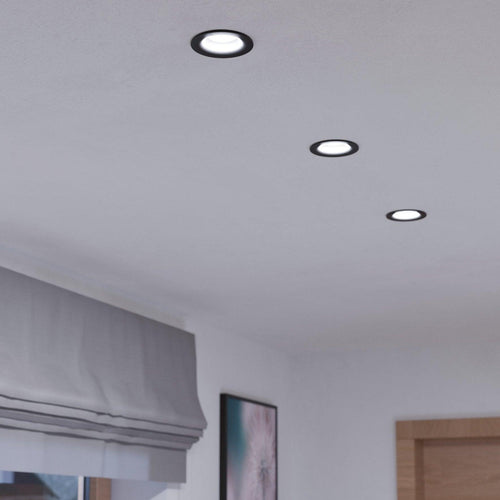 The SALICETO recessed LED light has a diameter of 88 mm and features a black aluminium body with a clear glass cover. The integrated LEDs produce a warm white light and are dimmable using a coordinating rotary dimmer on the wall. Showcasing a classic design and a depth of 50 mm, this recessed spotlight can be used in any living space, whether in the kitchen, living room, bedroom, hallway or dining room. A recess of 68 mm is required for installation.