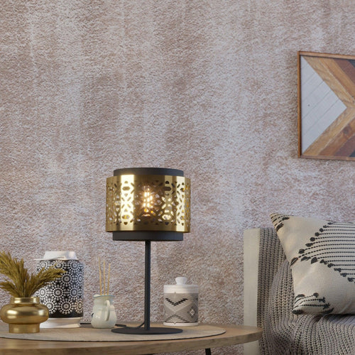 The SANDBACH table lamp showcases an Arab-inspired design with a black steel base and a round brass lampshade featuring a decorative cut-out pattern. The table lamp can be easily switched on or off via an in-line switch. The decorative cut-out pattern creates a beautiful display of light and shadow when switched on, offering cosy and elegant lighting in the bedroom on the bedside table, the living room, the dining room or the hallway. The table lamp has an E27 lamp holder and requires 1 x E27 lightbulb, which is not included.