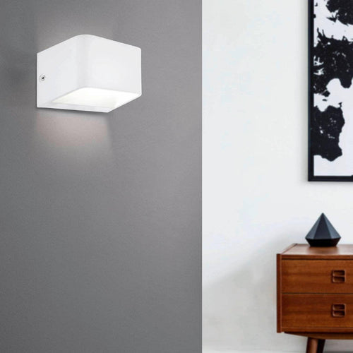 The SANIA 4 LED wall light has a cube-shaped body in a white aluminium finish. The integrated LEDs cast an indirect warm white light with the up-and-down design. The minimalist wall light has a modern look that can be integrated into various interior styles, providing cosy lighting in the living room, dining room, kitchen or hallways.