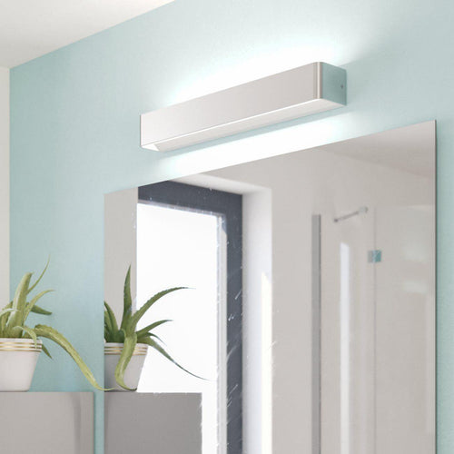 The SANIA 5 LED wall light has an elongated cube-shaped body in a matte nickel metal finish with a white inner surface. The integrated LEDs beneath the satin plastic cover cast an indirect warm white light with the up-and-down design. The product is suitable for use in the bathroom due to its IP44 protection against spray water. The minimalist wall light has a modern look that can be integrated into various interior styles, providing cosy lighting in the living room, dining room, kitchen or hallways.