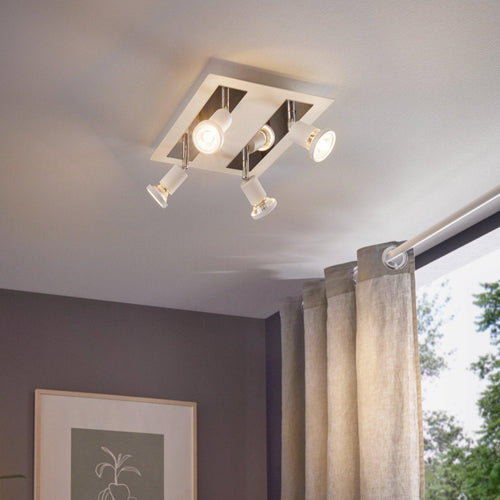 The SARRIA LED ceiling light features a square white metal body and four adjustable white metal spotlights. The light also features chrome-coloured metal details, which perfectly complement the minimalist design. The pivoting spotlights allow you to adjust the light to accentuate individual areas of the room, whether in the kitchen, the living room, the bedroom or the hallway. The product includes GU10 LED lightbulbs, which produce a pleasant warm white light.