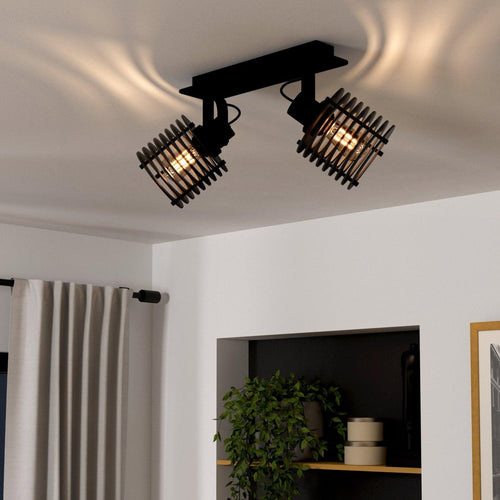 The SEGOVIA ceiling light features a black metal body and two adjustable spotlights. The spotlights are composed of black slats, creating fascinating displays of light and shadow when switched on. The swivelling ceiling spotlight fits seamlessly into modern interior styles and allows you to highlight and enhance specific accents or areas of the room, whether in the kitchen, living room, bedroom, hallway or dining room. The product has E27 lamp holders and requires 2 x E27 lightbulbs, which are not included.