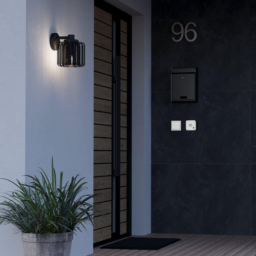 The SELINUS exterior wall light features a black metal body with a cylindrical caged lampshade made of metal strips. The lampshade has a downward position and houses an inner glass cylinder. The modern caged design stylishly complements the wall lights contemporary look while providing a dramatic display of light and shadow through the cut-out design. The product is suitable for outdoor use due to its IP65 protection against dust and low-pressure jets of water. With an elegant design, the product blends into any modern outdoor space. The pictured filament lightbulb is not included. The product has an E27 lamp holder and requires an E27 lightbulb.