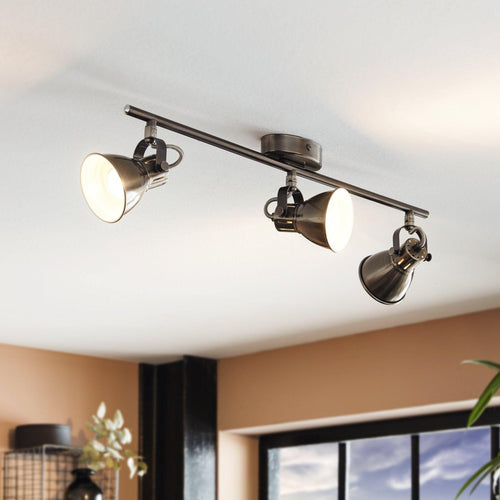 The SERAS LED ceiling light is made of metal and has three adjustable spotlights in an antique nickel finish. The ceiling spotlight’s trendy distressed finish and the cream-coloured inner surfaces of the shades perfectly complement modern interiors and provide good quality, focused lighting, whether in the kitchen, living room, bedroom or hallway. The product includes the pictured GU10 lightbulbs, which produce a pleasant warm white light.