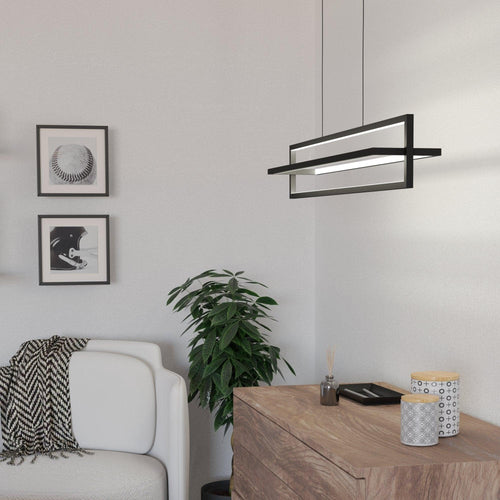 The SIBERIA LED pendant light showcases a modern design with a black steel structure and four white plastic interlocking LED panels hung from a black steel canopy. The integrated LEDs produce an adjustable white light, which can also be dimmed, all controlled from the included remote control. The contemporary and minimalist design complements various interior styles, whether in the living room or above the dining room table.