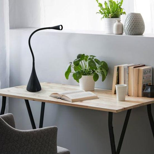 This table luminaire from the series SNAPORA is made of black plastic and aluminium. It has protective insulation and is equipped with an LED lamp for a warm white light. It can be switched on/off and dimmed by touching the specially designed “Touch Me“ p
