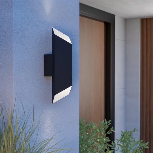 The SPIAZZINA exterior LED wall light has a geometric black metal body with a matte white inner finish. The integrated LEDs produce a pleasant warm white light. With its modern up and down design, this wall light blends into almost any outdoor area and provides stylish indirect lighting for external house walls. The exterior light is suitable for outdoor use due to its IP55 protection against dust and low-pressure jets of water.