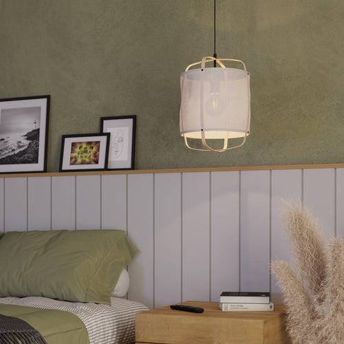 The SURFLEET pendant light features two natural bamboo frames surrounded by linen-effect cotton and button detailing. The pendant light blends seamlessly with trends such as nature and boho, creating an aspirational atmosphere with its natural materials. The product provides cosy lighting for any space, whether in the living room or above the table in the dining room. The lightbulb is not included. The product has an E27 lamp holder and requires an E27 lightbulb.