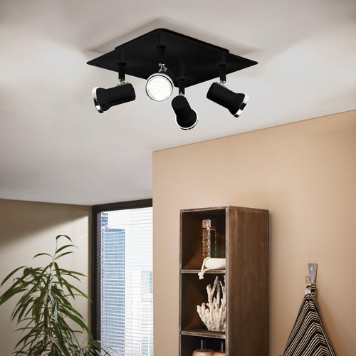The TAMARA 1 LED ceiling light has a black metal finish, a square glass ceiling mount and four adjustable spotlights. The ceiling light is suitable for use in the bathroom due to its IP44 protection against spray water. The chrome details enhance the high-quality design. The product includes GU10 LED lightbulbs, which produce a pleasant warm white light. The ceiling light blends superbly with modern interiors and provides stylish lighting in the bathroom.