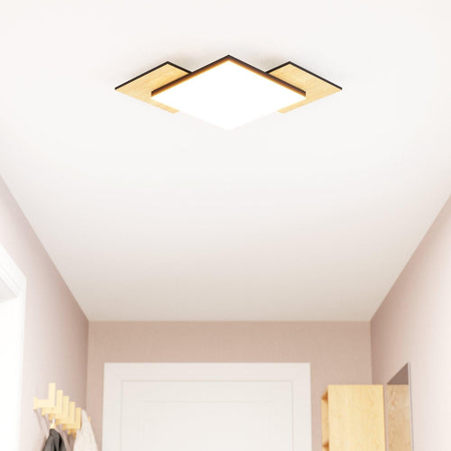 The TAMURIA LED ceiling light has a black metal finish and a square light panel made from white plastic. The LED panel has two decorative plates attached to the sides that are reversible to choose between the black or the oak wood side. The integrated LEDs produce a pleasant warm white light. The ceiling light blends with a wide range of interior design styles, providing ideal lighting in the living room, bedroom or hallway.