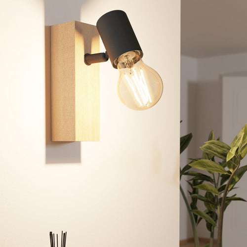 The TOWNSHEND 3 wall light features a wooden body and an adjustable black metal spotlight. The wall light has an eye-catching mix of pinewood and metal which works well in vintage or industrial-style interiors. The pivoting spotlight head allows you to adjust the light to accentuate individual areas of the room, whether in the living room, the bedroom, the hallway or the dining room. The pictured filament lightbulb is not included. The product has an E27 lamp holder and requires an E27 lightbulb.