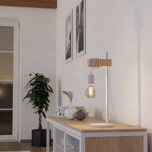 The TOWNSHEND table lamp is made of white metal and has a wooden arm and a white lamp holder. With its eye-catching mix of pinewood and metal, the table lamp complements modern interior design trends such as Scandi and vintage. The product switches on and off using the in-line switch. Whether on a bedside table, in the living room, dining room or hallway, it provides modern lighting for any interior. The pictured milky-white bulb is not included. The product has an E27 lamp holder and requires an E27 lightbulb.