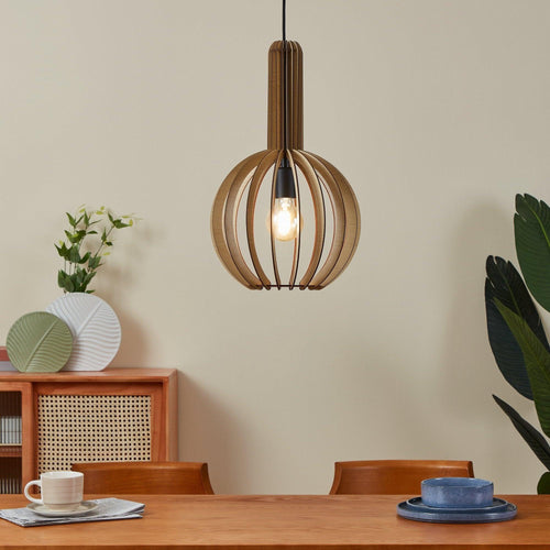 The VELASCO pendant light has a spherical lampshade made of maple-coloured wood segments, a black textile cable and a black metal canopy. The wooden segment design creates a fascinating play of light and shadow when the light is on. The pendant light has a diameter of 31cm and a Scandi design, which complements modern interior design styles and provides welcoming lighting in the living room, bedroom or dining room. The pictured filament lightbulb is not included. The product has an E27 lamp holder and requires an E27 lightbulb.